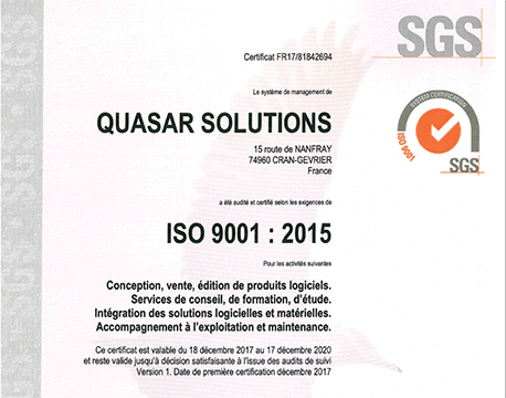 QUASAR is ISO 9001-2015 certified. All internal processes comply with the standard’s requirements. To ensure regular follow-up of service quality and to strive for continuous improvement, each department communicates monthly its performance indicators and its areas of improvement to our quality referent. The latter regularly monitors the correct application of the standard’s key principles and ensures optimal operation of the company’s quality processes.